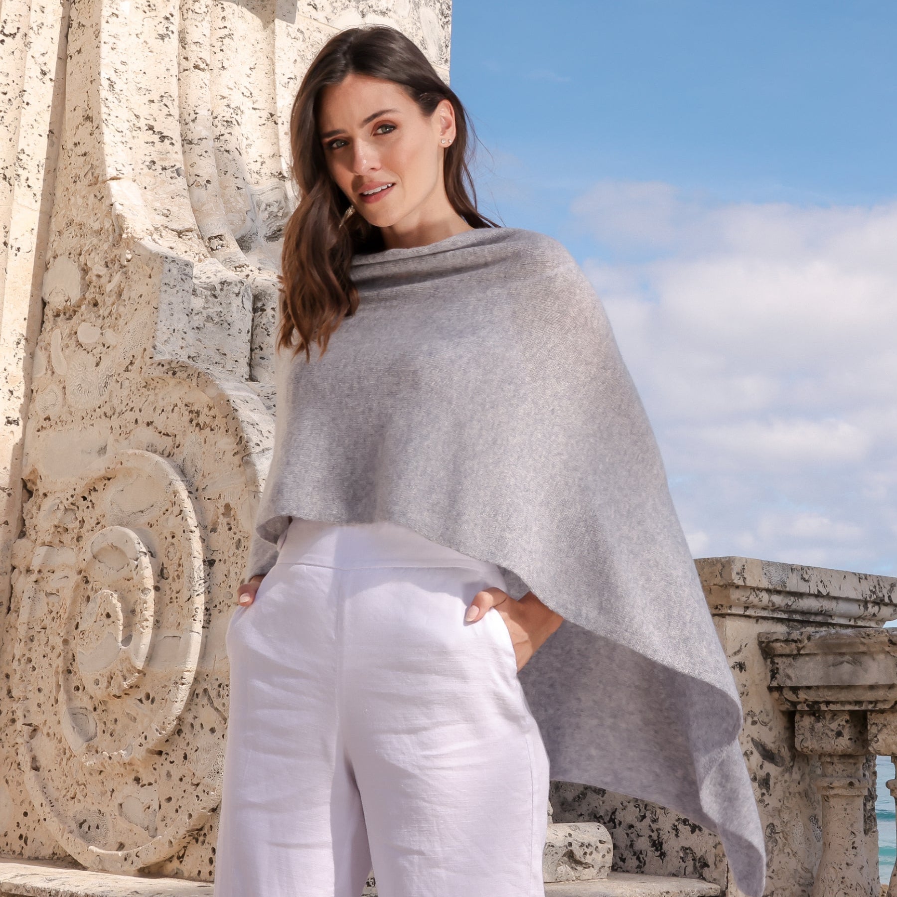 Made of 100% cashmere. Versatile, light and soft. Can be worn many ways. Small enough to carry in your purse for chilly restaurants or for chilly plane rides. Can dress it up over a dress or skirt or dress it down with a pair of jeans.